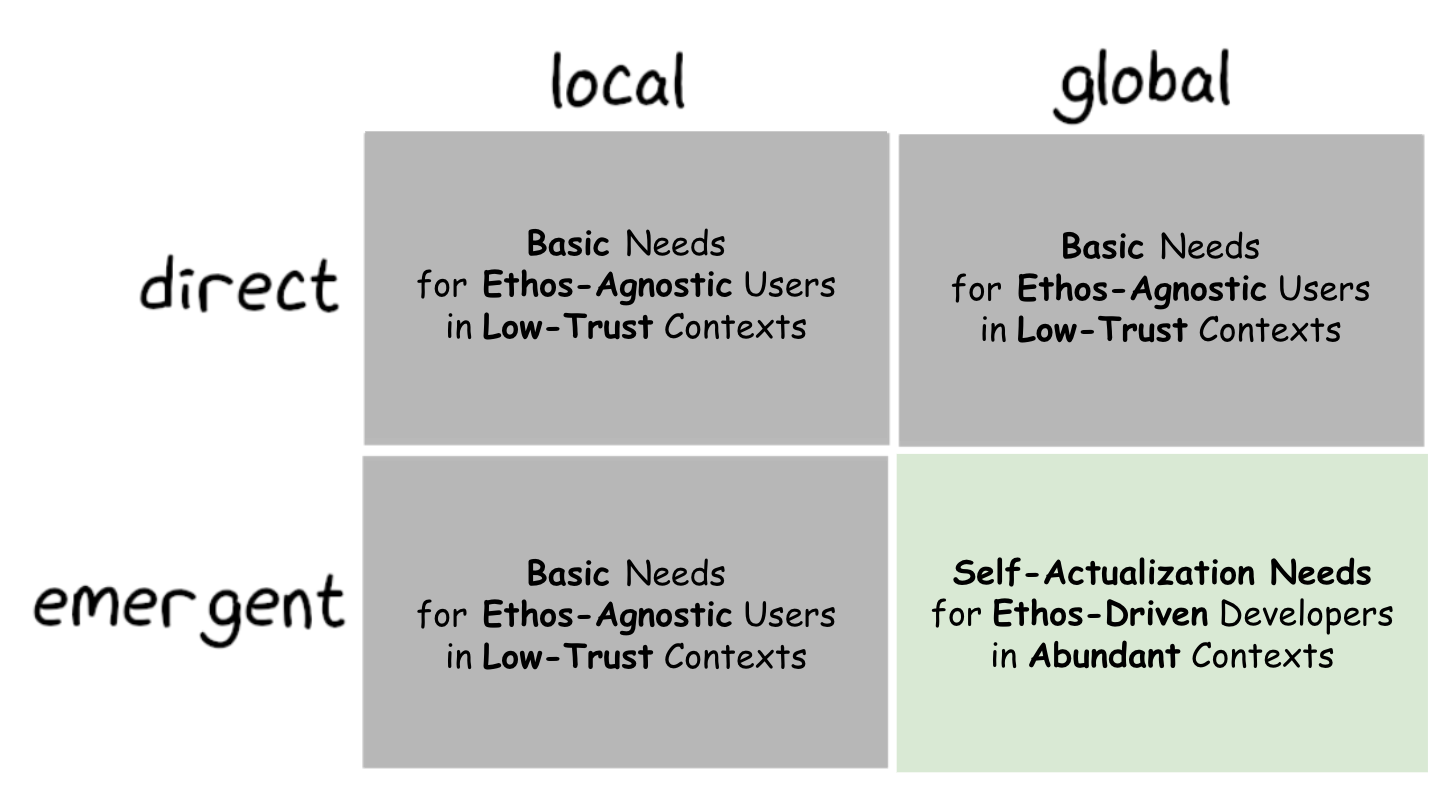 Or, to put this in the language/visuals of Nathan Wilcox, Jon Choi, and Tony Sheng: crypto provides the self-actualization needs of ethos-driven developers in abundant contexts by creating positive outcomes at the global emergent level. In contrast, crypto provides the basic needs of ethos-agnostic users in low-trust contexts by creating positive outcomes at the local direct level.