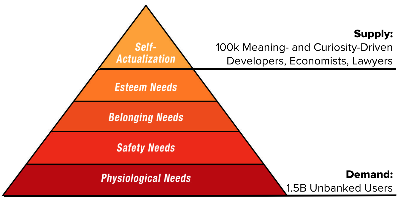In words: Blockchain supply comes from 100k self-actualization- and integrity-driven creators, while blockchain demand comes from the 1.5B unbanked adults (in addition to demand from things like regulatory arbitrage).