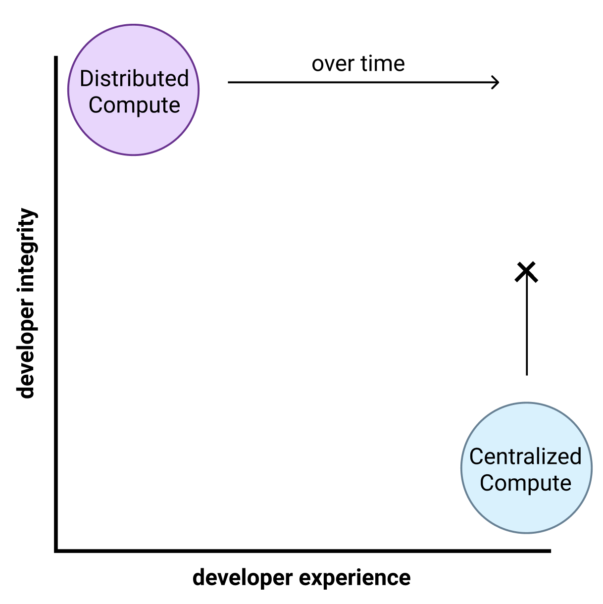In other words, the underlying protocol has "integrity" that allows developers to build on it. Right now, the developer experience for building on these distributed protocols is worse than centralized platforms. However, we expect blockchain developer experience to get better and eventually rival centralized platforms. In contrast, centralized platforms will never be able to beat decentralized protocols on integrity (given their technical architecture). Dani summarizes all of this in the graph below: