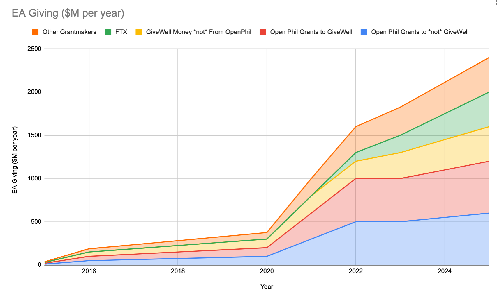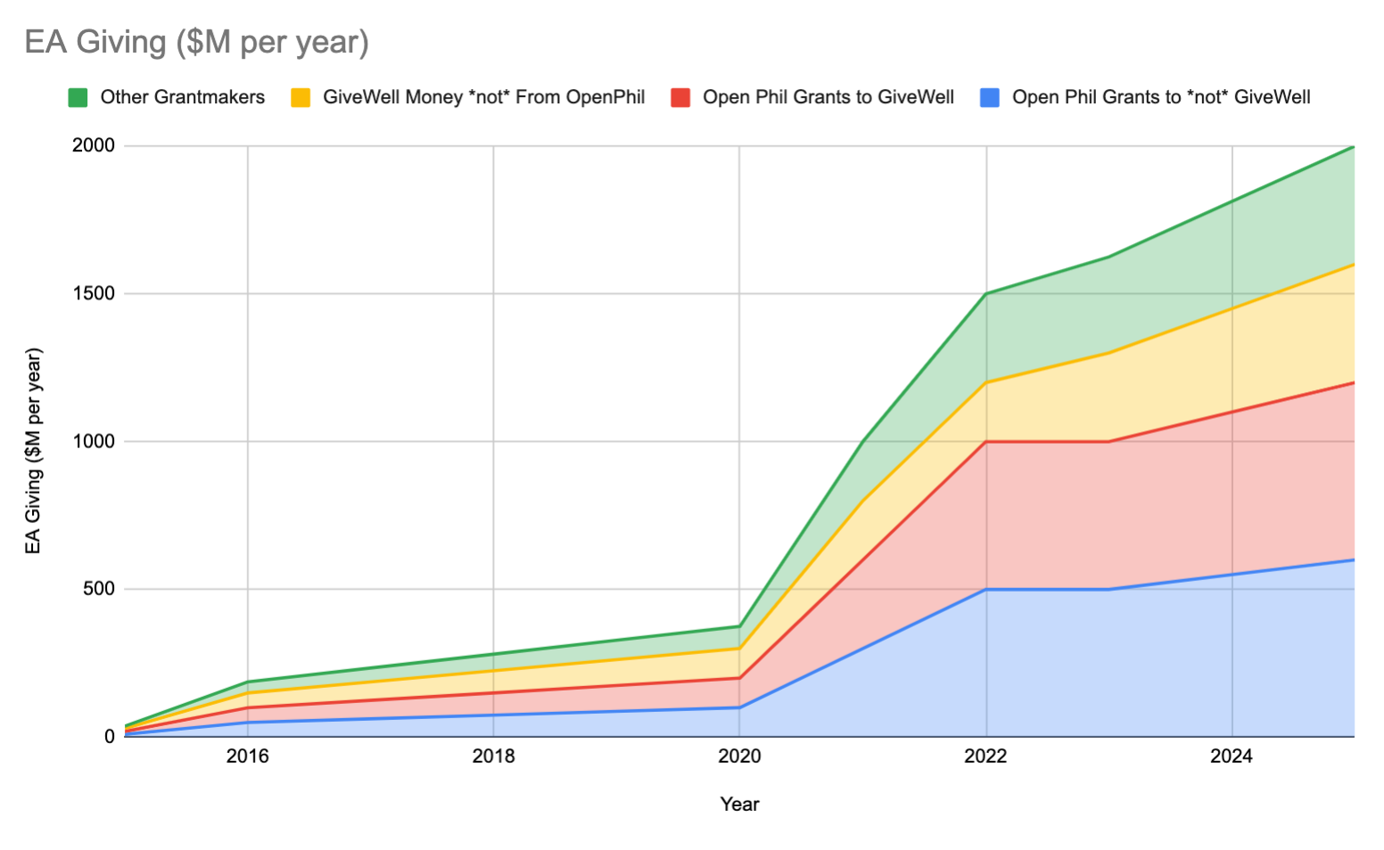 So, taking GiveWell and Open Phil together, here's how much EA money has been given per year throughout the 2020s: