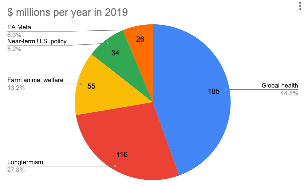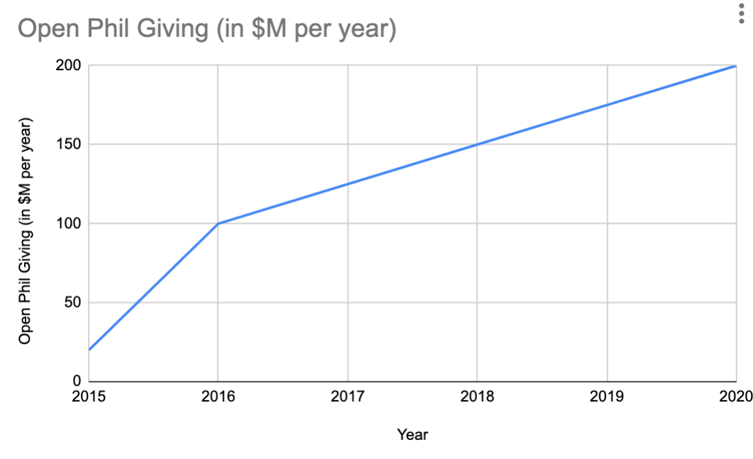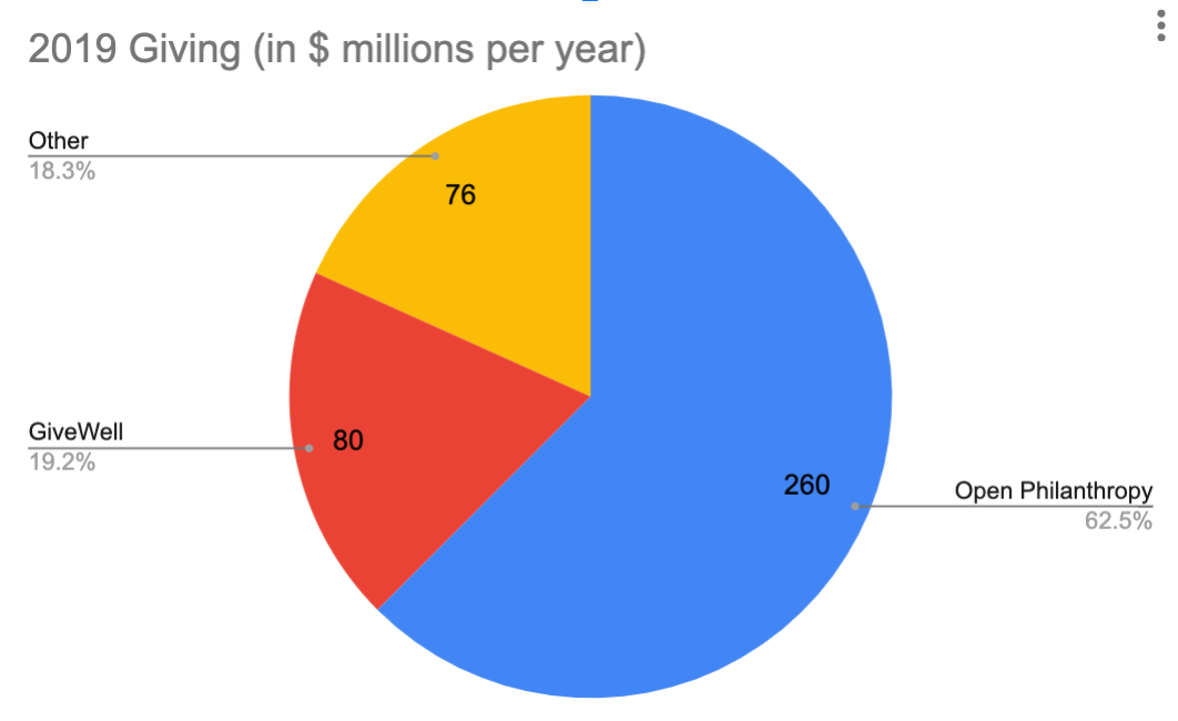 - Not quite sure why some numbers don't add up. 1) Ben Todd averaged 2017-2019 to get $260M. I can't quite tell how much Open Phil themselves say they gave in 2019. They just say "over $200M". 2) The graph here shows that Give Well raised $91M from Open Phil in 2020. But then Open Phil says they granted $100M. I'm working with public data and doing napkin math so ¯\_(ツ)_/¯
