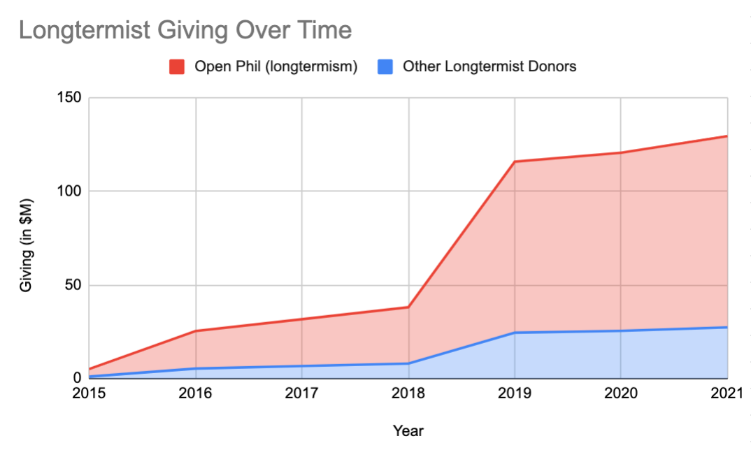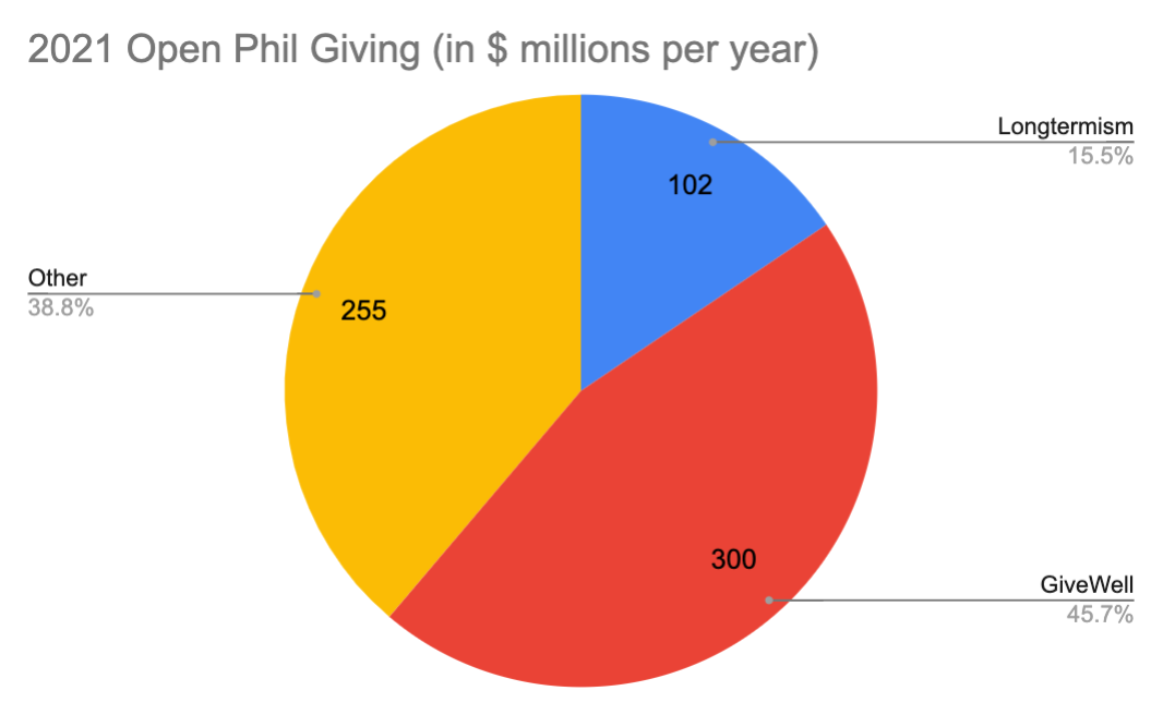 As you can see, longtermism (in red) is roughly 30% of all EA giving. In 2021, it was roughly 15% of Open Phil giving.