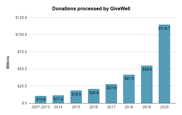 But this is actually going to ramp up a bunch in the coming few years. Open Phil only regranted $100M to GiveWell in 2020, but they plan to grant GiveWell $300M in 2021, $500M in 2022, and $500M again in 2023.
