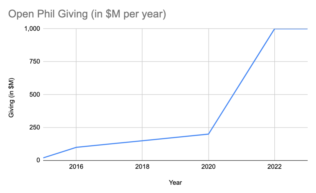 So by increasing their 2022/2023 GiveWell giving to $500M, we'd roughly expect Open Phil to give $1B by that time: