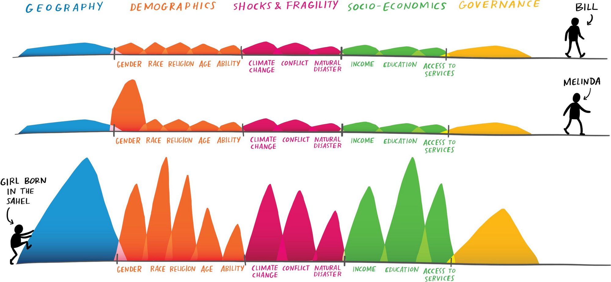 - To help provide kids around the world with the opportunities you were given. See one of my favorite images below from the Bill and Melinda Gates Foundation. It shows how tough it is for a girl born in the Sahel (or Chiri) to access opportunity. So many things in her way. You can help her overcome the stuff in green!